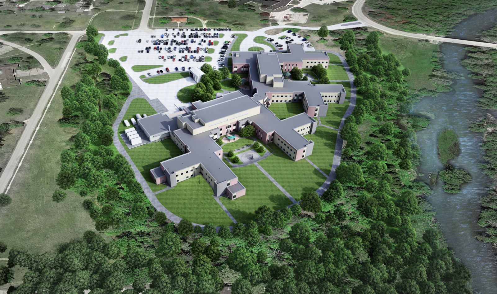 In 2019 the State of Michigan re-imagined their vision and goal for the new hospital to be a single facility with capacity for 100 beds. The 200-bed solution was not constructed.