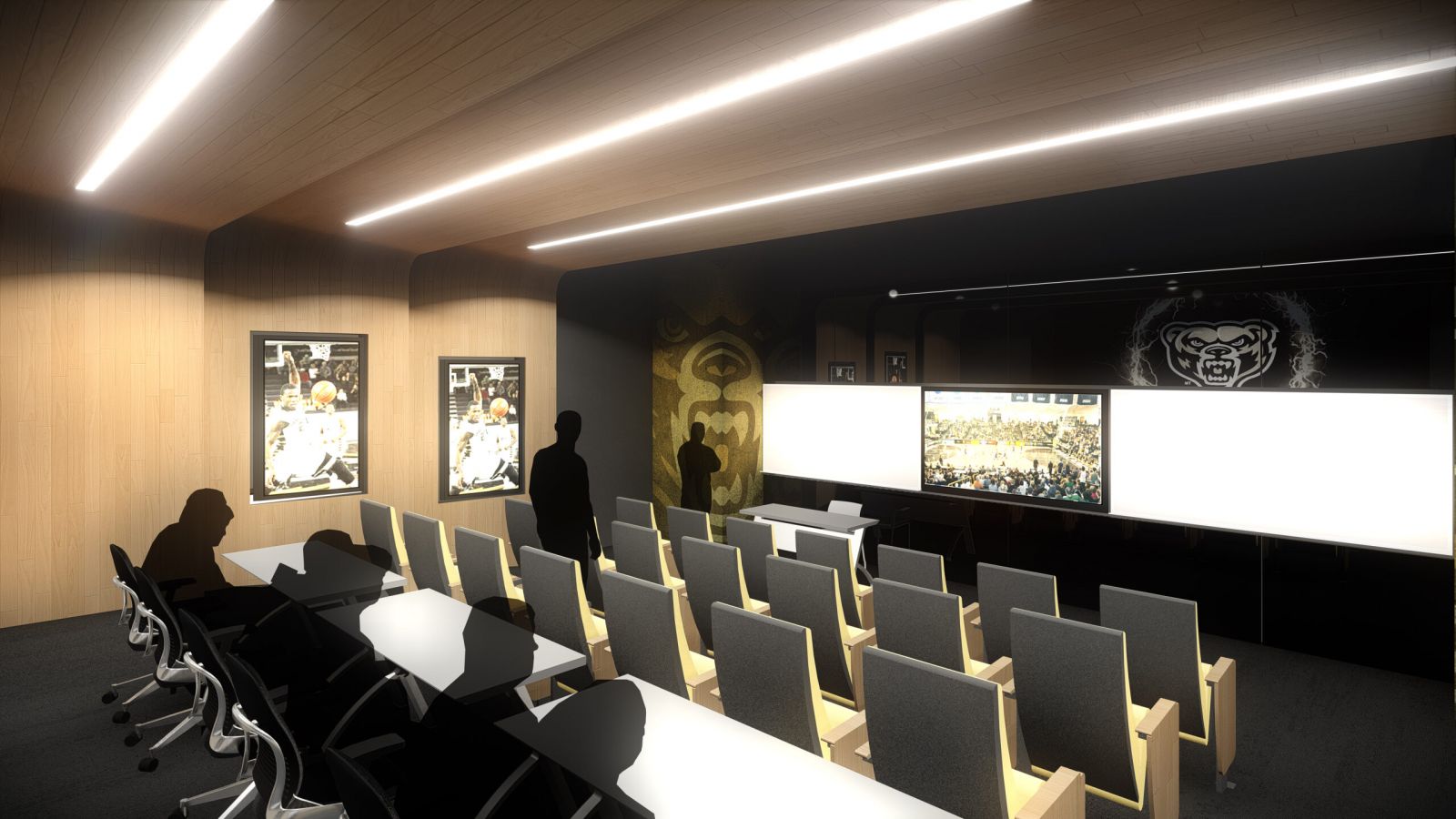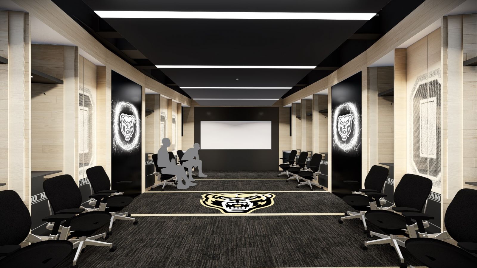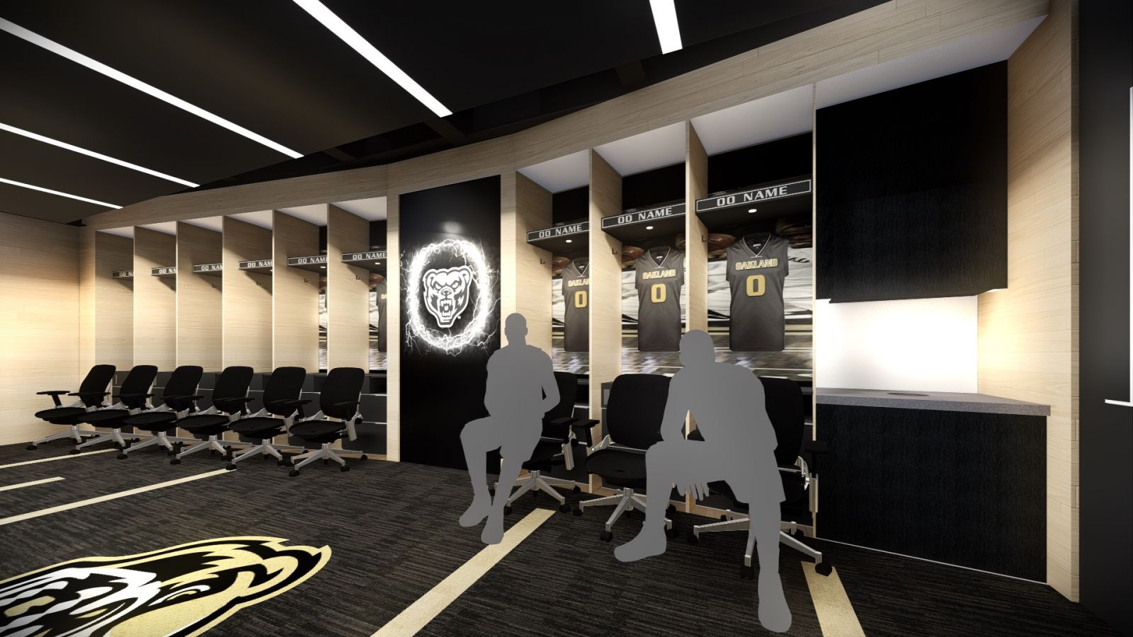The project’s design seeks to amplify the strong sense of community among Oakland University’s athletic staff and student-athletes. The implementation of social spaces, new technologies and a seamless connection to the existing building have become the means to achieve this. Intended to be the athletic social hub, the academic activity center is stretched across two levels, connecting the existing locker rooms with the administration offices, forming both a quiet study area and group recreation space in the process. The feature stair that spans these levels acts as a communal bridge allowing for foot traffic as well as group congregation.