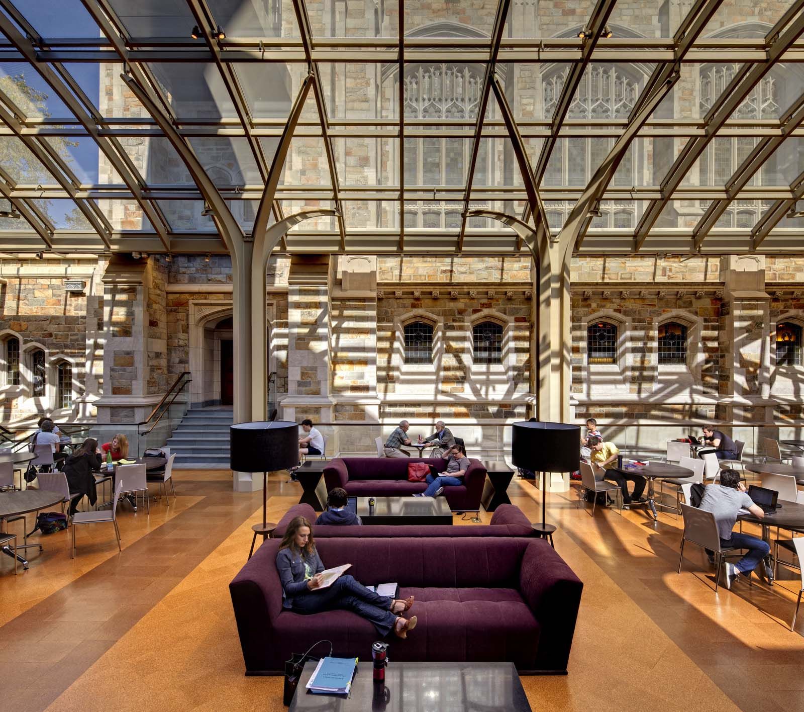 The Robert B. Aikens Commons was conceived as a central hub to bring together all law school extensions and departments within the University of Michigan’s historic Law Quad. Over time, law-related activities had scattered across campus, and this project aimed to consolidate them while creating a stunning student center seamlessly integrated into the existing collegiate Gothic architecture. The solution: a soaring, curved glass roof supported by steel, enclosing the space while preserving the historic facades of the surrounding buildings.