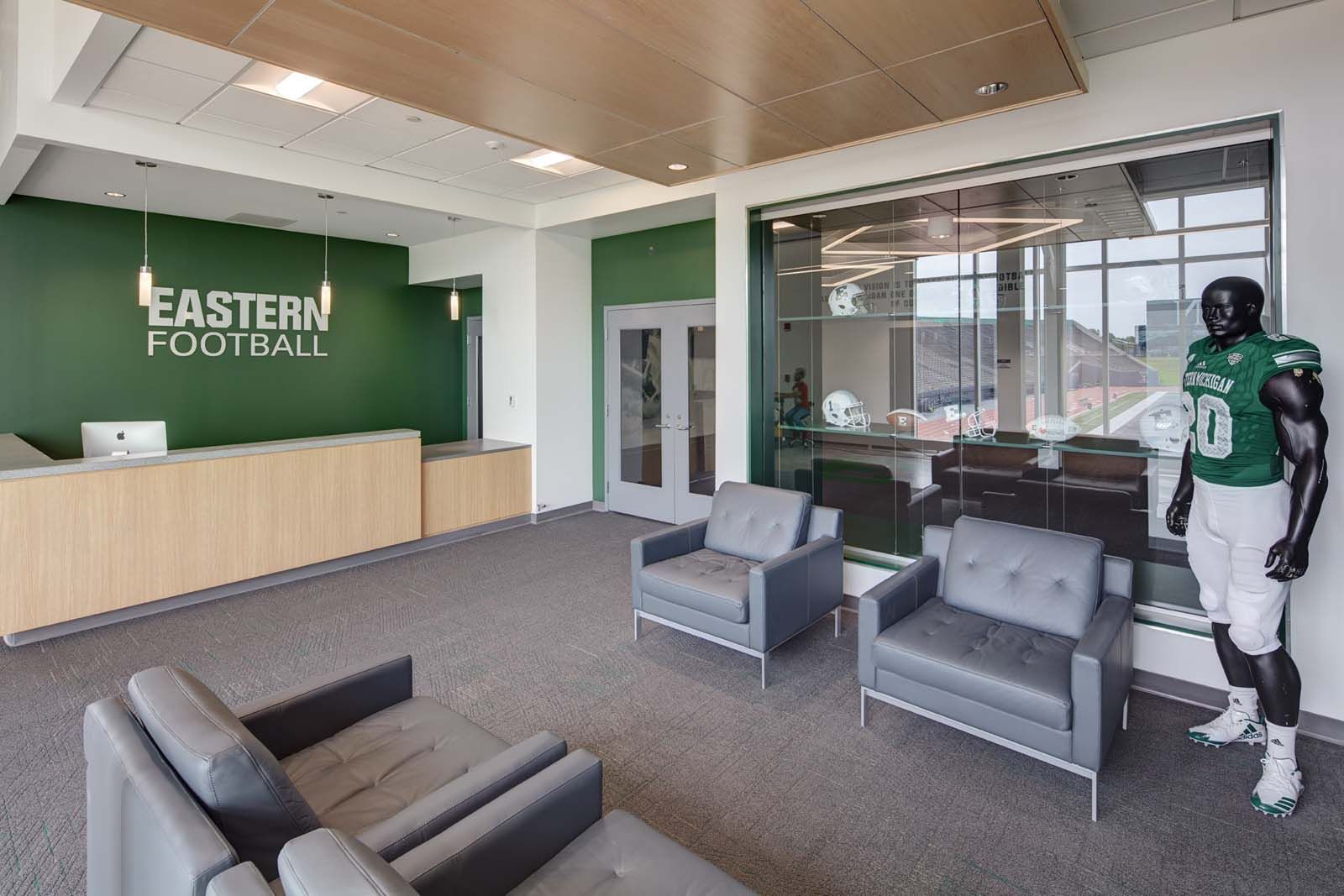 This student athlete facility defines the northern boundary of Rynearson Stadium as the home for Eastern Michigan football and as a space for all student athletes to come train. The building interior celebrates the architectural structure, creating a dynamic experience for athletes, staff and visitors alike. The 60,000 sf of program is organized along a wide public corridor that faces the field. This space acts as both circulation and a gathering space. During events, this space welcomes fans with high-top tables and seating, offering open views of the field in an enclosed space. The building also includes a 7,000 sf all athlete weight training facility with direct access to the field.