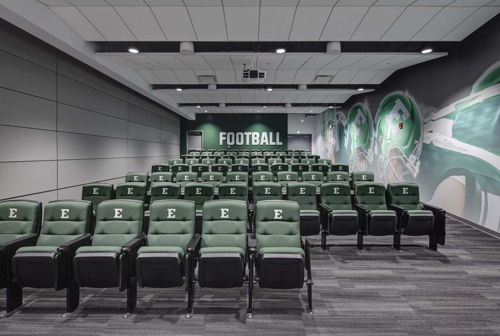 By locating the entire program to the north of a main spine, we were able to create an extremely efficient building from a NCAA contact time and cost perspective. All heavily trafficked rooms such as the locker room, team meeting, lounge and weight training spaces are at field level and adjacent to one another, which will allow for a significant reduction in travel time throughout the day.