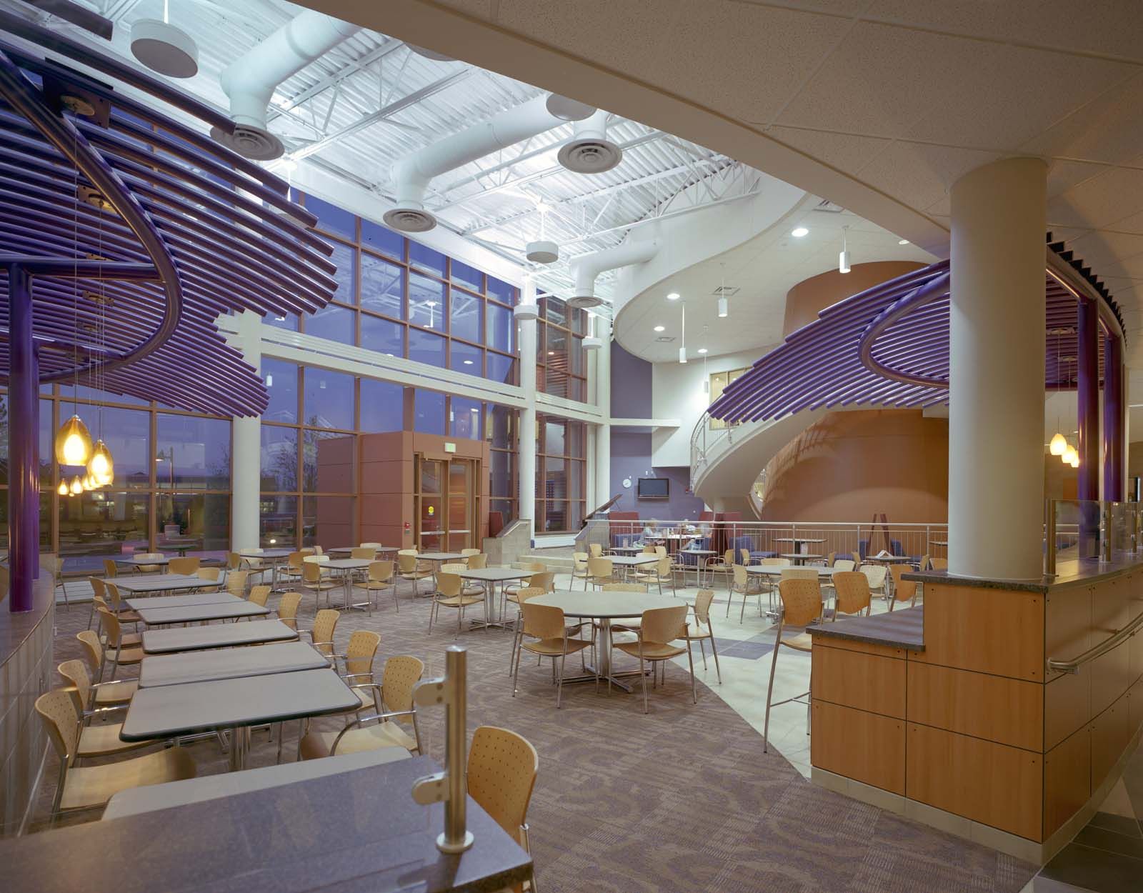 Upon entering the two-story space, students are immediately immersed in an atmosphere of energy and warmth. A bold central entryway leads to a soaring social space filled with dynamic patterns, vibrant colors, and engaging architectural elements. A spiral staircase and conical-shaped elevator tower reinforce the Center’s sense of vitality and connectedness, while metal trellises define more intimate seating areas. Perforated wood walls glow with multicolor LED lighting, adding a sense of movement and excitement. The dining area, designed with a bistro-style ambiance, offers a welcoming and comfortable space for students to relax, dine, and engage with their peers.
