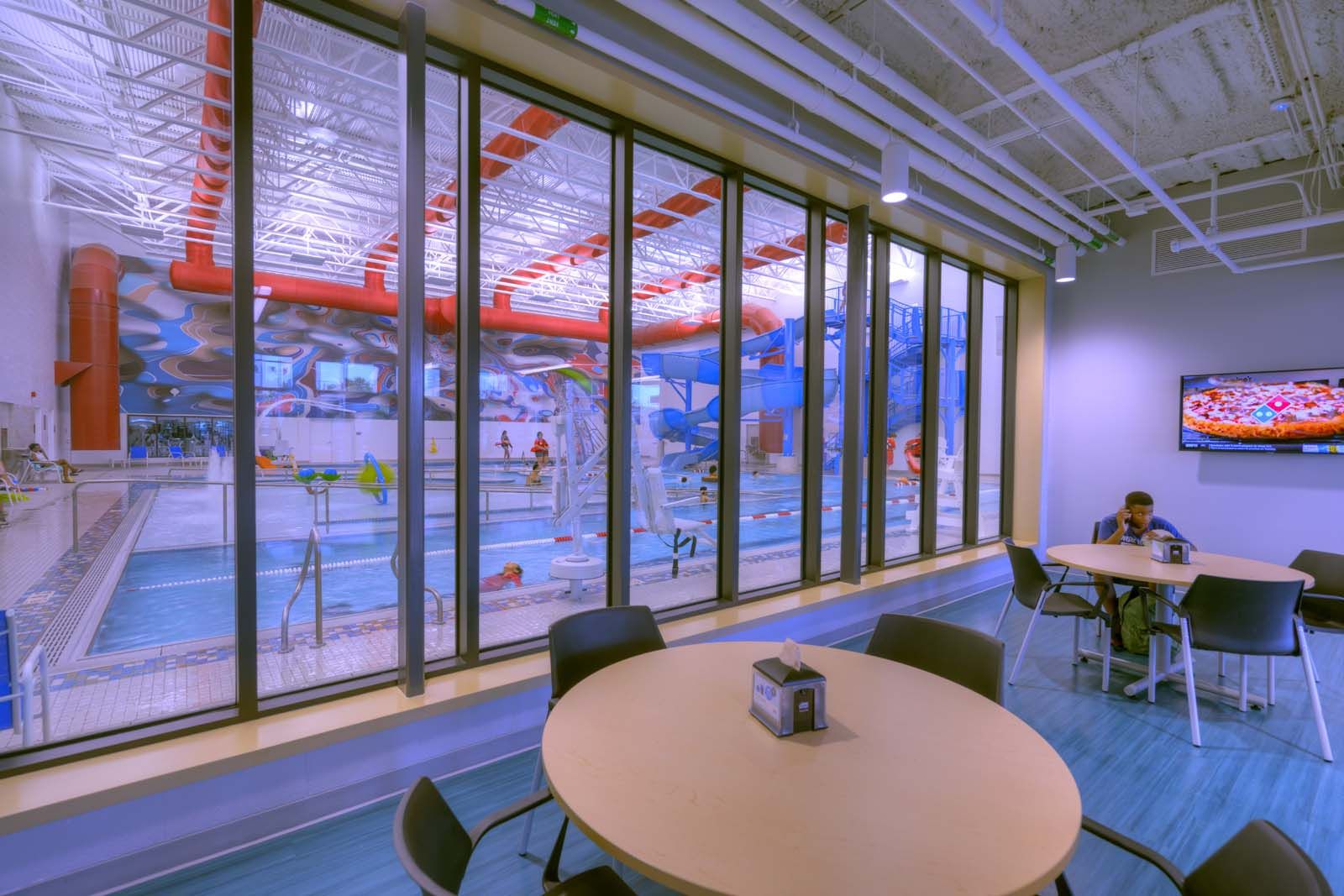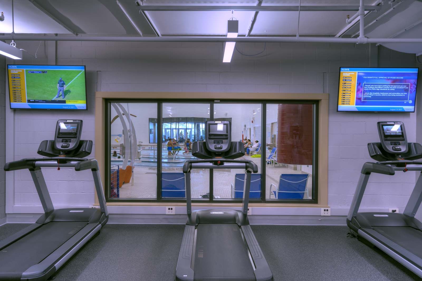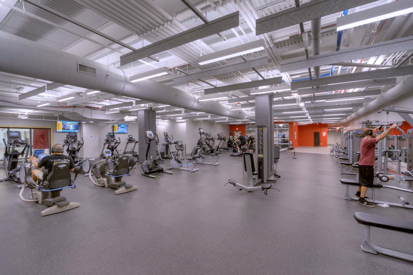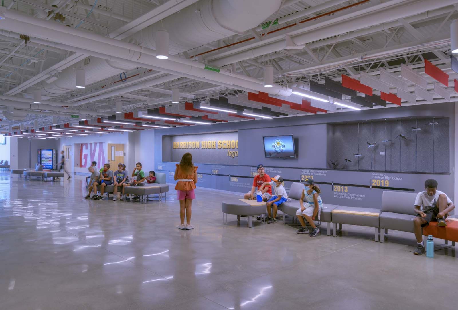 The renovation creatively repurposed former high school spaces into vibrant new community assets. The band room was transformed into a black box theater, while the gymnasium area now houses a fitness center, complete with group fitness rooms and a spacious dance studio. To celebrate the history of Harrison High School while establishing a new identity for the Community Center, the project preserved key elements such as the turf field logos and Herrington Plaza near the stadium. A dedicated display in the gym and fitness center lobby pays tribute to the school’s legacy, ensuring that its spirit remains an integral part of this revitalized community space.