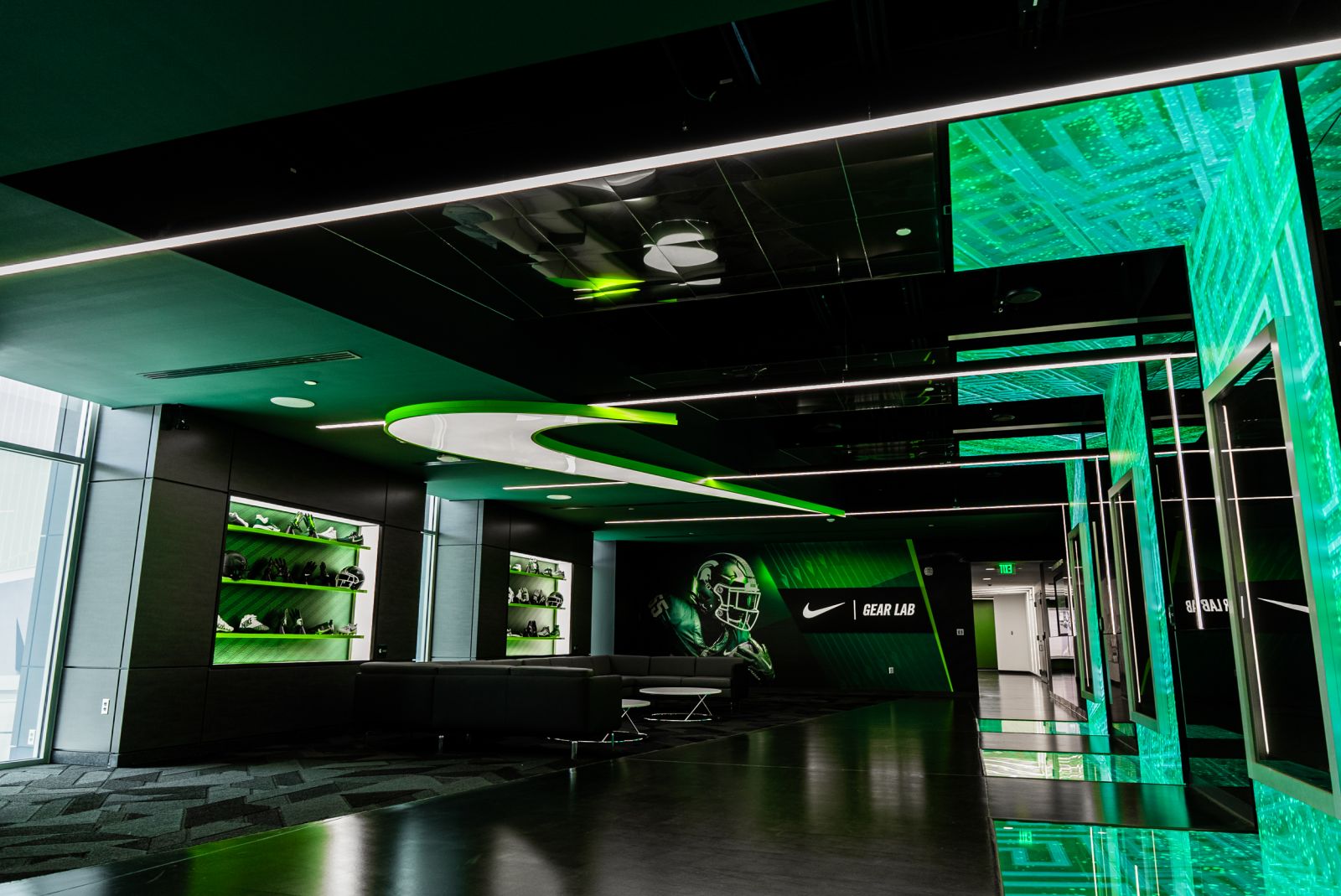 The new 65,000-square-foot addition places all student-athlete spaces on the north end of the building, cutting off any cross traffic from the rest of the football spaces. The remainder of the addition is entirely dedicated to the football program, the heart of which is the new locker room suite.